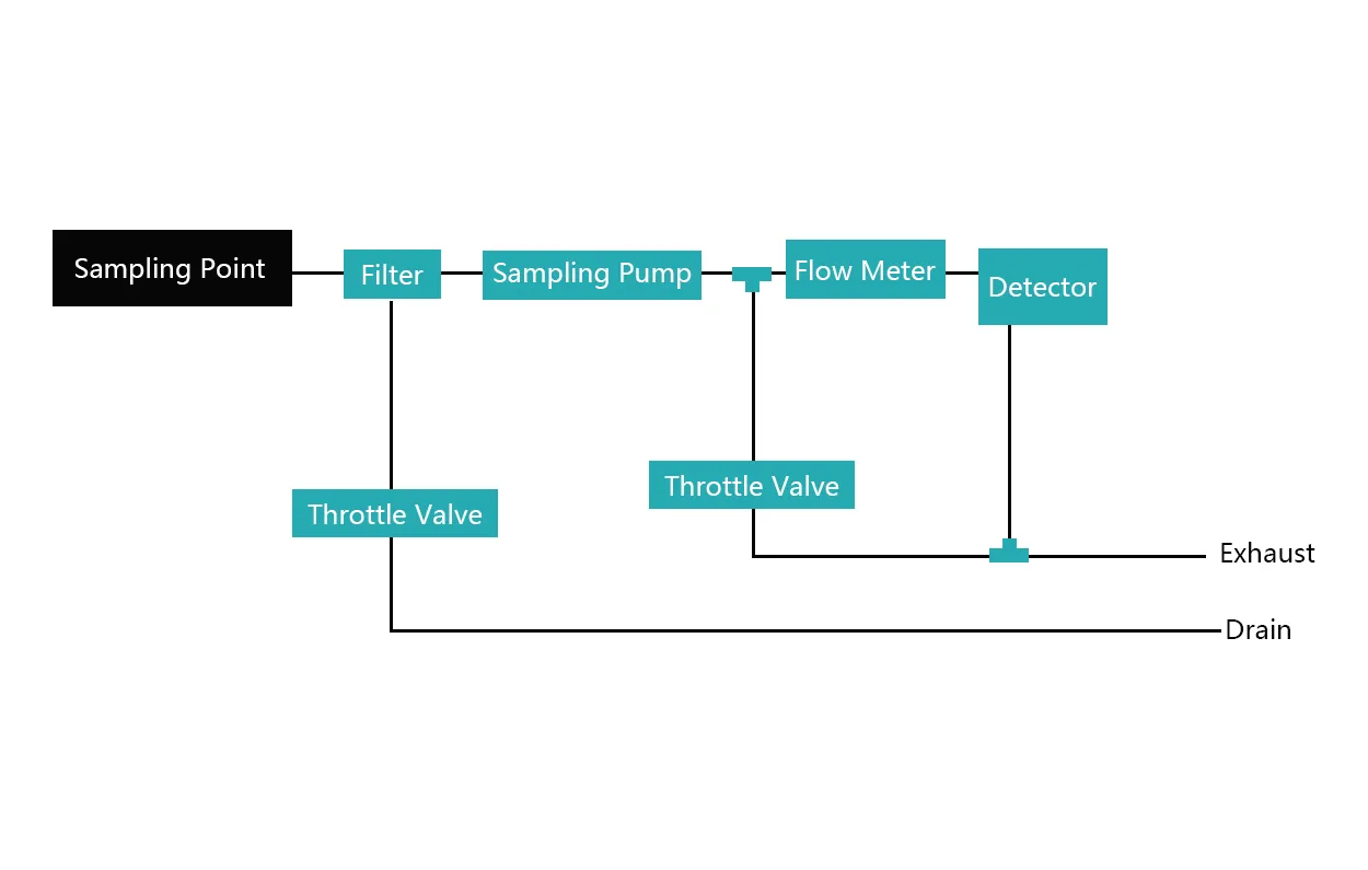 5. A flow meter controls the flow rate of the drawn-in gas (generally set between 0.3–0.5 L/min). Finally, the gas reaches the instrument for detection (the instrument's operating environment should be within -20°C to 60°C).