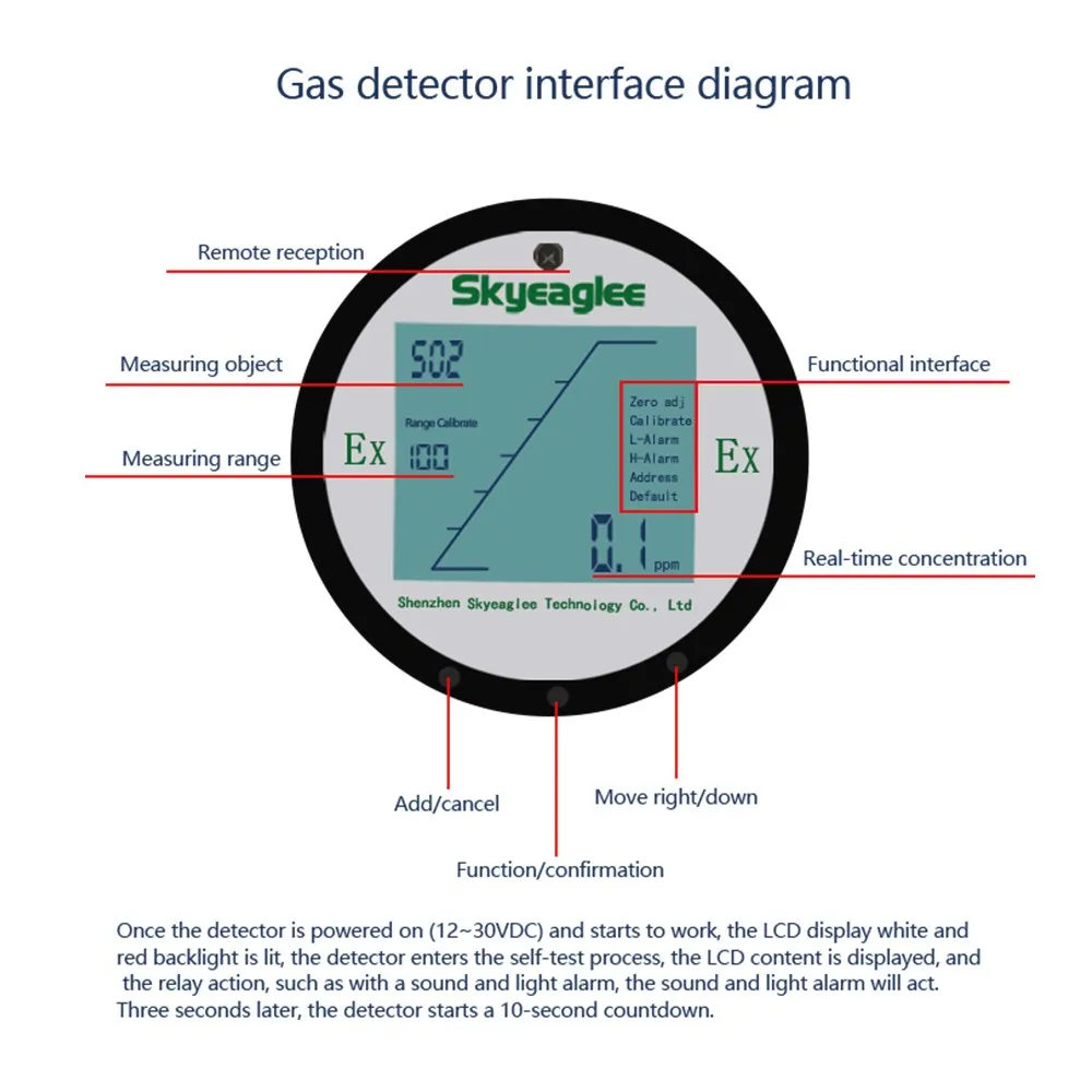 Sensor Specifications: Detection range 0-100 ppm, response time ≤30s, working temperature -10℃~+50℃, automatic zero point tracking to prevent drift.
