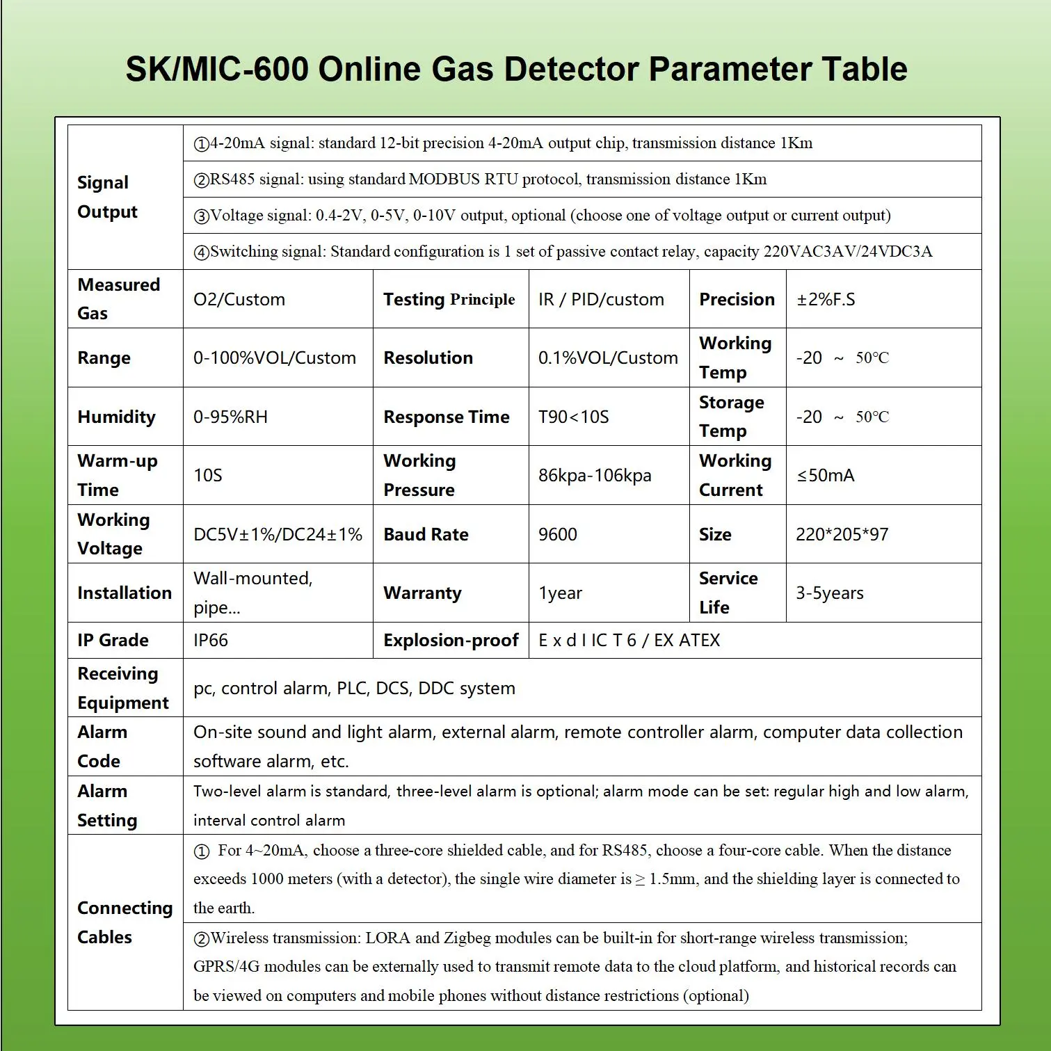 Detection gas:EX_Flammable-CH4 Range:0-100%LEL (3-100%LEL) / 0-5%VOL Detection Principle:Infrared Resolution:0.1%LEL_0.001%VOL Detection Accuracy:±2%F.S Model:SK/MIC-600