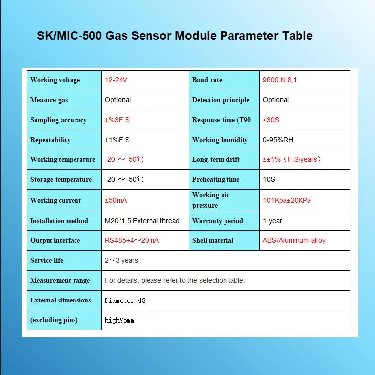 Detection gas:EX_Flammable-CH4 Range:0-100%LEL (3-100%LEL) / 0-5%VOL Detection Principle:Infrared Resolution:0.1%LEL_0.001%VOL Detection Accuracy:±2%F.S Model:SK/MIC-600