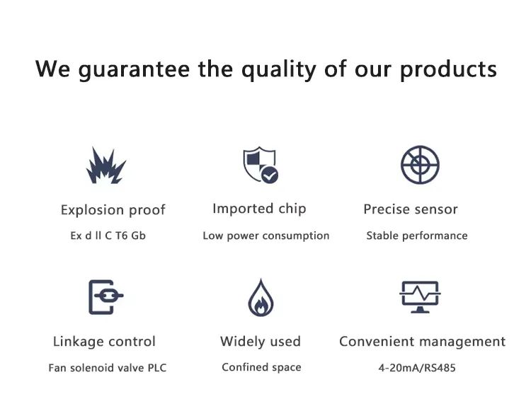 The detector uses imported sensors combined with high-speed and high-precision processing circuits. It has the advantages of stable signal, high precision and good repeatability. It also adopts an explosion-proof design and is suitable for various hazardous situations. The instrument outputs various standard signals and is compatible with various alarm systems, PLC, DCS and other control systems.