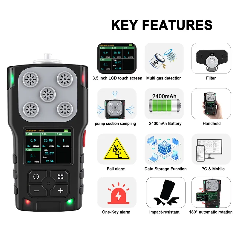 Portable Pumping & Diffusion Combustible Gas Detector HNAG920 is suitable for real-time and accurate detection of gas concentration and leakage in various environments, with advantages such as fast response, high measurement accuracy, excellent stability, and repeatability. It supports both pumping and diffusion modes in one unit, can be expanded to detect up to 5 gases simultaneously, and supports 4G/WiFi/Bluetooth/LoRa wireless transmission modes. The device is equipped with a built-in 2400mAh lithium battery.